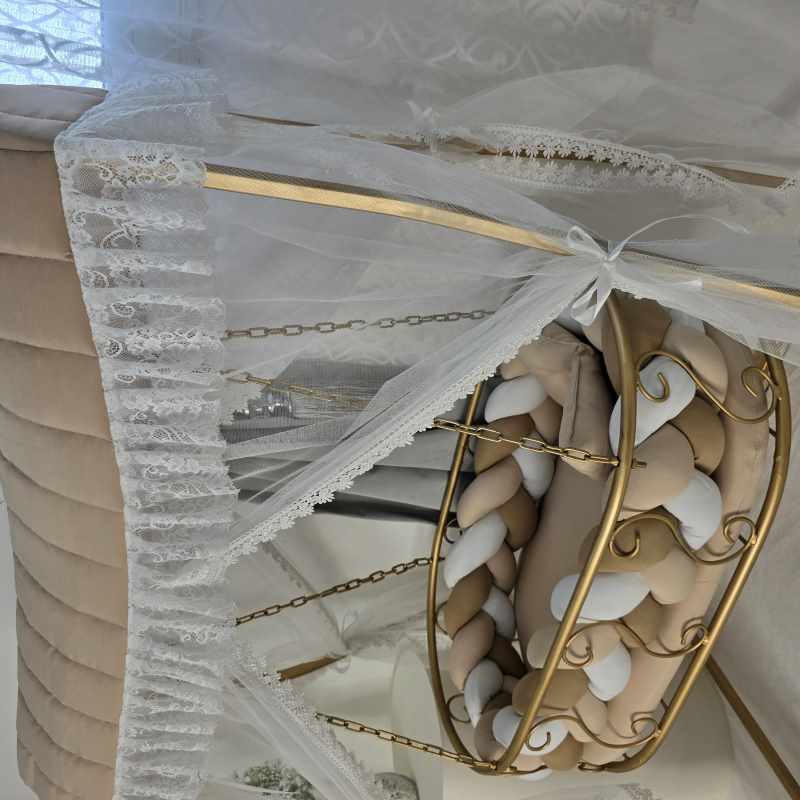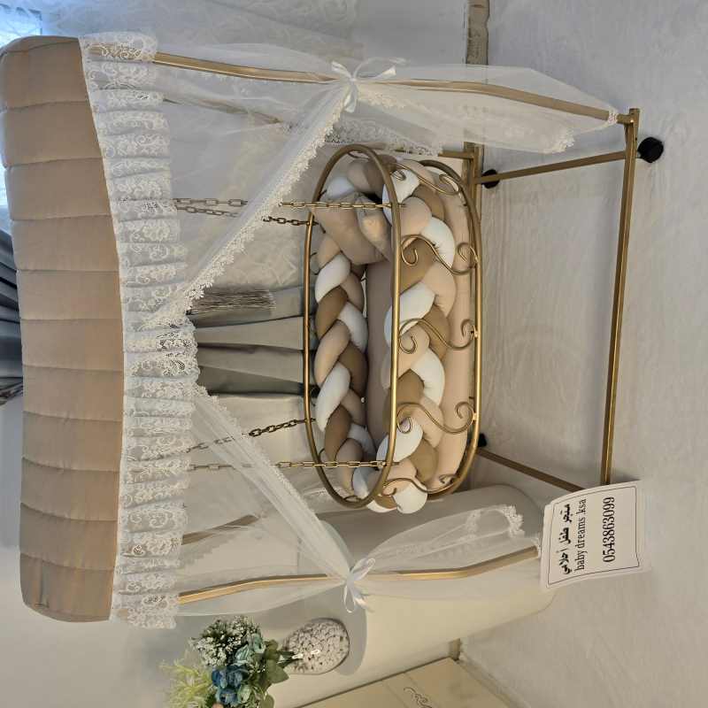 أرجوحة سرير حديد للمواليد مع كفرات وفرش ومخدة وظفيرة جانبية.